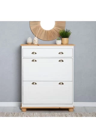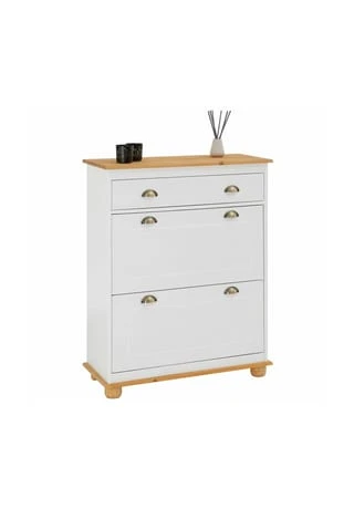 Der Schuhschrank COLMAR ist aus massivem Kiefernholz gefertigt und in der Farbe gebeizt oder weiß erhältlich. Entscheiden Sie, ob Sie den Schuhschrank mit 2,3 oder 4 Klappen wünschen, denn je nach Ausführung finden 12-20 Paar Schuhe ihren Platz. Der Schuhschrank ist im Landhausstil gefertigt und die Muschelgriffe sowie die beiden vorderen Kugelfüße runden den typisch natürlichen Look ab. Materialbeschreibung: Der Schuhschrank ist aus massivem Kiefernholz gefertigt und die Oberfläche ist gebeizt oder weiß lackiert. Die Lacke sind schadstoffarm und lösemittelfrei. Austattung / Merkmale des Produkts: mit 2, 3 oder 4 Klappen Platz für 12, 16 oder 20 Paar Schuhe bronzefarbene Muschelgriffe aus Metall 2 vordere Kügelfüsse Versand & Montage: Lieferumfang: Schuhkommode inklusive Aufbauanleitung Artikel wird zerlegt geliefert Kundenfreundliche Montage mit Hilfe der leicht verständlichen Aufbauanleitung Lieferung erfolgt ohne Dekoration Lieferung erfolgt per Paketdienst