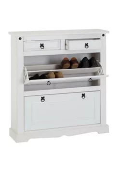 DER SCHUHSCHRANK TEQUILA findet durch seine schmale Bauweise in jedem Flur Platz. Außerdem verfügt unsere Schuhablage über genügend Platz, um Ihre Schuhe zu verstauen. In den Schubladen haben Sie auch noch ausreichend Platz Ihre Schirme, Mützen, Schal oder Handschuhe zu verstauen. Auch Kleider lassen sich leicht in unserem Wäscheschrank unterbringen. Unser einfaches aber dennoch stilvolles Schuhregal lässt sich hervorragend mit Ihren bereits vorhandenen Möbeln kombinieren. Materialbeschreibung: Der Schuhschrank ist aus massivem Kiefernholz gefertigt und in 3 Farben erhältlich. Das Holz stammt aus nachhaltiger Forstwirtschaft. Die Griffe sind aus Metall gefertigt und schwarz lackiert. Ausstattung: 8 Fächer: 44 x 13 x 30 cm (B x H x T) 2 Schubladen: 32 x 12 x 27 cm (B x H x T) Inklusive Tür Versand & Montage: Lieferumfang: Kleiderschrank TEQUILA, ohne Dekoration Lieferung erfolgt per Paketdienst Artikel wird zerlegt geliefert Kundenfreundliche Montage mit Hilfe der beigelegten Aufbauanleitung