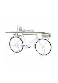 Stylischer Hingucker nicht nur für Zweirad-Enthusiasten. Das ausgediente Fahrrad trägt eine Tischplatte aus Mangoholz. Zwei Stützen halten die Fahrrad-Konsole stabil und aufrecht. Fahrradfahren ist heutzutage das Gegenteil von Alte-Leute-Sport. Es ist modern, umweltfreundlich und für viele die schönste Möglichkeit, sich in der Natur zu bewegen. Auch Sie sind dieser Faszination erlegen? Dann können Sie Ihrer Passion jetzt auch zu Hause frönen. Besser gesagt auf der Terrasse, denn dort wartet vielleicht bald dieses stylische Modell auf sie. Es wird Sie zwar keinen Berg mehr hinaufbringen, trägt aber eine massive Mangoholzplatte, die Ihnen als praktische Ablage nützlich sein wird. Zum Beispiel beim Osterbrunch oder beim Grillen mit Freunden oder wenn Sie einen gemütlichen Abend zu zweit verbringen möchten und auf der Konsole ein paar appetitliche Häppchen angerichtet sind. Das schon von Natur nässeunempfindliche Mangoholz wurde gewachst, was es zusätzlich schützt. gleichzeitig harmoniert das Holz durch das weiße Finish besonders schön mit dem antikweiß lackierten Fahrradgestell aus Eisen. Die stabile Holzkiste bietet eine extra Ablagefläche für diverse Dinge, aber auch Blumen oder Kräuter sehen hübsch darin aus.