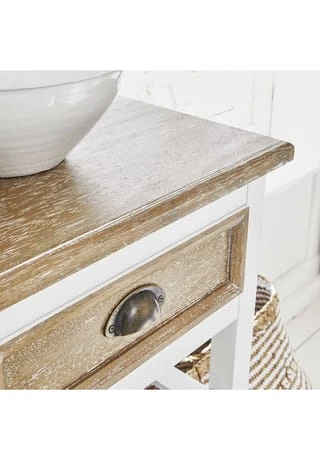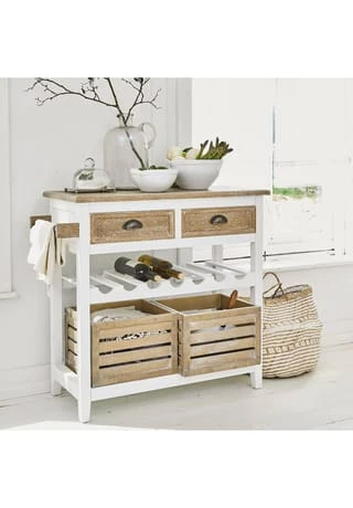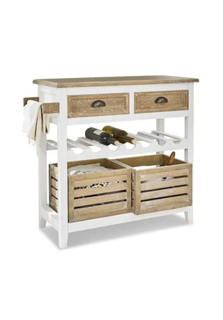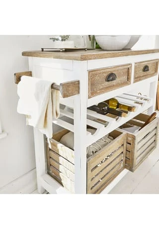 Stilvolle Handarbeit. Klassischer Landhaus-Stil. Hübsches Antik-Finish und viel Stauraum. Ein echtes Highlight für jede Küche. Und zudem ein elegantes Stauraumwunder. Holen Sie sich dieses gemütliche Flair nach Hause und machen Sie Ihre Küche zum neuen Lieblingsort. Die Platte, Schublade und die Holzkisten sind farblich abgesetzt. Zwei Schubladen, eine seitliche Reling für Handtücher, eine Flaschenablage für sieben Flaschen und zwei praktische Holzkisten bieten viel Stauraum.