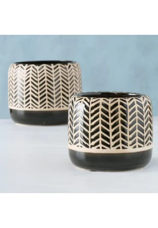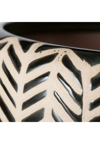 Pflanztopf aus Steingut mit aufgerautem und lasiertem Relief in beigem Grundton mit schwarzem geometrischen Muster.