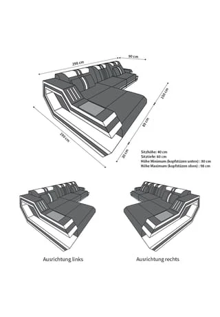 So modern das äußere Erscheinungsbild der Wohnlandschaft Ravenna ausfällt, so bequem ist das Sofa im täglichen Einsatz. Multifunktionale Kopfstützen und eine hochwertige Bonell Federung sorgen für herrlich entspannende Stunden. Die großzügig bemessene Liegefläche lädt zu einem kraftspendenden Schläfchen ein. Für den Bezug stehen Ihnen vier Lederarten zur Auswahl, von einer Mischung aus Echt- und Kunstleder bis hin zu besonders weichem Büffelleder. Jede dieser Varianten erhalten Sie in verschiedenen attraktiven Farben. Falls Sie das Ledersofa Ravenna um ein Gästebett erweitern möchten, bestellen Sie es einfach inklusive Schlaffunktion. Sogar einen passenden Couchtisch haben wir auf Lager. Damit ist Ihre moderne Ruheoase perfekt. Luxus-Kunstleder: Alle beanspruchten Teile, wie die Sitzflächen und Rückenlehnen, werden mit echtem Italienischen Leder bezogen. Hochwertiges Nappa Leder mit schöner Narbung und Weichheit. Die Rückseite, Seitenteile oder bodennahe Zierstreifen, werden durch ein farblich passendes ?Soft Life Premium” Kunstleder ergänzt (100% PU) Kunstleder: Das hochwertige Soft Life Premium Kunstleder hat eine feine Ledernarbung und einen weichen Textilrücken. Das Leder ist UV-beständig, hautverträglich, schweißbeständig und wasserabweisend. (100% PU) Long-Life-Leder LONG Hochwertiges Rindsleder aus Italien mit feiner Narbung und exzellenten Eigenschaften. Es ist besonders weich und nur mit einer leichten Pigmentierung versehen. Leder BULL Premium Dickleder der höchsten Qualität. Es besticht vor allem durch seine Weichheit und seinen unverwechselbaren Charakter. Mit einer Stärke von 1,4 1,6 mm und seiner typischen Narbenstruktur genügt es höchsten Ansprüchen. Die Qualität unseres Büffelleders ist deutlich zu sehen und vor allem zu spüren.