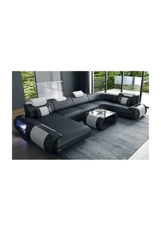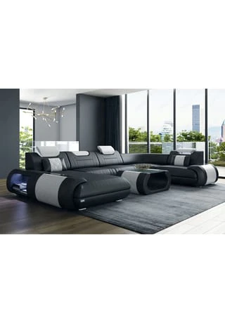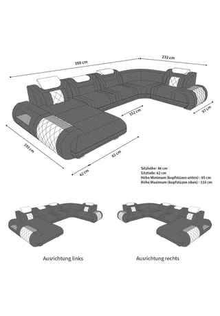 Ein gestepptes Design in den Armlehnen und hochwertige Lederbezüge sind ein starkes Gespann. Als dritte Zutat für Ihr neues Lieblingssofa schwebt Ihnen ein großes Platzangebot vor? Unsere Wohnlandschaft Rimini in U-Form erfüllt in jeder Beziehung hohe Ansprüche. Ausgestattet mit einer herrschaftlichen Liegefläche und vielen bequemen Sitzgelegenheiten, eignet sie sich hervorragend als zentraler Ort für gesellige Abende. Dann kommt auch die in den Seiten integrierte LED-Beleuchtung zur Geltung. Dank Touch-Wheel-Fernbedienung wechseln Sie mit einer Fingerbewegung die Lichtfarbe – ein Highlight auf jeder Party. Apropos Farbe: Das Ledersofa Rimini erhalten Sie mit unterschiedlichen Bezügen in verschiedenen Farben. Luxus-Kunstleder: Alle beanspruchten Teile, wie die Sitzflächen und Rückenlehnen, werden mit echtem Italienischen Leder bezogen. Hochwertiges Nappa Leder mit schöner Narbung und Weichheit. Die Rückseite, Seitenteile oder bodennahe Zierstreifen, werden durch ein farblich passendes ?Soft Life Premium” Kunstleder ergänzt (100% PU) Kunstleder: Das hochwertige Soft Life Premium Kunstleder hat eine feine Ledernarbung und einen weichen Textilrücken. Das Leder ist UV-beständig, hautverträglich, schweißbeständig und wasserabweisend. (100% PU) Long-Life-Leder LONG Hochwertiges Rindsleder aus Italien mit feiner Narbung und exzellenten Eigenschaften. Es ist besonders weich und nur mit einer leichten Pigmentierung versehen. Leder BULL Premium Dickleder der höchsten Qualität. Es besticht vor allem durch seine Weichheit und seinen unverwechselbaren Charakter. Mit einer Stärke von 1,4 1,6 mm und seiner typischen Narbenstruktur genügt es höchsten Ansprüchen. Die Qualität unseres Büffelleders ist deutlich zu sehen und vor allem zu spüren.