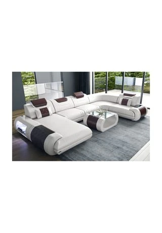Ein gestepptes Design in den Armlehnen und hochwertige Lederbezüge sind ein starkes Gespann. Als dritte Zutat für Ihr neues Lieblingssofa schwebt Ihnen ein großes Platzangebot vor? Unsere Wohnlandschaft Rimini in U-Form erfüllt in jeder Beziehung hohe Ansprüche. Ausgestattet mit einer herrschaftlichen Liegefläche und vielen bequemen Sitzgelegenheiten, eignet sie sich hervorragend als zentraler Ort für gesellige Abende. Dann kommt auch die in den Seiten integrierte LED-Beleuchtung zur Geltung. Dank Touch-Wheel-Fernbedienung wechseln Sie mit einer Fingerbewegung die Lichtfarbe – ein Highlight auf jeder Party. Apropos Farbe: Das Ledersofa Rimini erhalten Sie mit unterschiedlichen Bezügen in verschiedenen Farben. Luxus-Kunstleder: Alle beanspruchten Teile, wie die Sitzflächen und Rückenlehnen, werden mit echtem Italienischen Leder bezogen. Hochwertiges Nappa Leder mit schöner Narbung und Weichheit. Die Rückseite, Seitenteile oder bodennahe Zierstreifen, werden durch ein farblich passendes ?Soft Life Premium” Kunstleder ergänzt (100% PU) Kunstleder: Das hochwertige Soft Life Premium Kunstleder hat eine feine Ledernarbung und einen weichen Textilrücken. Das Leder ist UV-beständig, hautverträglich, schweißbeständig und wasserabweisend. (100% PU) Long-Life-Leder LONG Hochwertiges Rindsleder aus Italien mit feiner Narbung und exzellenten Eigenschaften. Es ist besonders weich und nur mit einer leichten Pigmentierung versehen. Leder BULL Premium Dickleder der höchsten Qualität. Es besticht vor allem durch seine Weichheit und seinen unverwechselbaren Charakter. Mit einer Stärke von 1,4 1,6 mm und seiner typischen Narbenstruktur genügt es höchsten Ansprüchen. Die Qualität unseres Büffelleders ist deutlich zu sehen und vor allem zu spüren.