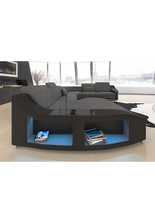 Die Leder Wohnlandschaft Swing XXL ist die größte Ausführung dieser Reihe. Auf der Designer Couch findet wirklich jeder seinen Platz. Natürlich überzeugt auch die XXL Version mit seinem wunderschönen Design. Das Chesterfield Muster harmoniert perfekt mit den Rundungen der Designer Couch und verleiht ihm eine elegante Austrahlung. Auch an den Funktionen wird bei der Leder Wohnlandschaft nicht gespart. Beleuchtung – Energieffizienzklasse: Geeignet für Leuchtmittel der Skala A++ bis E Beleuchtung Modellkennung : 50502 Breite: 399 cm Länge: 294 cm Höhe: 85 cm Sitzehöhe: 40 cm Sitztiefe: 60 cm Optional: Schlaffunktion (ausziehbares Bett), Getränkekühler mit USB – Handy Ladestation, elektrische Relax Funktion Farben: Bei einer Farbkombination wie zum Beispiel “rot-weiss” ist die erste Farbe (rot) immer die Hauptfarbe, welche den Großteil des Sofas ausmachen wie Sitzflächen und Rückenlehnen. Bei der Zweitfarbe (weiss) handelt es sich um eine Akzentfarbe, welche zum Beispiel die Zierstreifen oder Kopfstützen haben. Bezugsstoffbeschreibung: Luxus-Kustleder = ECHT-/KUNSTLEDER MIX Bei dieser Version werden alle unmittelbar beanspruchten Teile, wie die Sitzflächen und Rückenlehnen, mit echtem Italienischen Rindsleder bezogen. Um Ihnen gleichzeitig einen attraktiven Preisvorteil zu ermöglichen, werden bei dieser Bezugsvariante die nicht unmittelbar beanspruchten Teile, wie z.B. die Rückseite, Seitenteile oder bodennahe Zierstreifen und Armlehnen, durch ein farblich passendes ?Soft Life Premium” Kunstleder ergänzt. Kunstleder = KUNSTLEDER PREMIUM Bei Dieser Variante fertigen wir Ihr Sofa komplett in einem hochwertigen Kunstleder an. Unser Soft Life Premium Kunstleder hat eine feine Ledernarbung und einen weichen Textilrücken. Das Leder ist UV-beständig und wird auf Grund seiner hohen Qualität und Beständigkeit auch von vielen namhaften Möbelherstellern verwendet. Es ist besonders hautverträglich, schweißbeständig, wasserabweisend und reißfest. Long-Life-Leder Long = ECHTLEDER PREMIUM Bei dieser Ausführung wird das Sofa vollständig mit echtem italienischem Nappaleder bezogen. Es handelt es sich hierbei um ein hochwertiges Rindsleder aus Italien mit feiner Narbung und exzellenten Eigenschaften. Es ist besonders weich und nur mit einer leichten Pigmentierung versehen, um die Oberfläche gegen das Eindringen von Flüssigkeit und gegen Verschmutzungen besser zu schützen. Leder Bull = BÜFFELLEDER PREMIUM Bei unserem exklusiven Büffelleder handelt es sich um ein Premium Dickleder der höchsten Qualität. Mit einer Stärke von 1,4 1,6 mm und seiner typischen Narbenstruktur genügt es höchsten Ansprüchen. Die Qualität unseres Büffelleders ist deutlich zu sehen und vor allem zu spüren und es erfreut sich gerade bei Kennern sehr großer Beliebtheit.