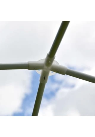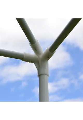 Einfach, leicht und praktisch. Dieser preiswerte 3×3-Meter-Pavillon mit seiner 110g/m²-PE-Plane incl. 2 Seitenteilen überzeugt durch seine durchdachte Bauart und sein geringes Gewicht. Besonders wenn man unterwegs schnell eine Überdachung braucht, leistet dieser Pavillon gute Dienste. Beim Aufstellen benötigen Sie keinerlei Werkzeug und die Montage kann durch das praktische Klicksystem von einer Person erledigt werden. Egal ob schnell die Kaffeetafel für den Geburtstag in den Schatten muss, der Angler am See vor Regen geschützt auf seinen Fang wartet oder die Clique beim Festival abends gemütlich feiert – ein ruckzuck aufgestelltes Dach braucht man immer mal. Die offene Bauart des Gartenzelts ermöglicht einen Zugang von allen Seiten. Bei Bedarf können Sie auch weitere Seitenteile hierfür zum Komplett-Verschließen bei uns erstehen (mit Fenster oder ohne Fenster). Die Plane besteht aus wasserabweisendem 110g / m² PE-Material und schützt Sie bei leichtem Regen und vor Spritzwasser – ideal als Unterstand, Windschutz, Sonnendach bei Eventveranstaltungen, als Flohmarktzelt, Schankzelt oder Jahrmarktzelt und Wetterschutz bei jeglichen Festivitäten. Bitte beachten Sie, dass es sich hierbei um eine Leichtbaukonstruktion handelt, die starkem Regen oder Sturm unter Umständen nicht Stand hält. Bauen Sie den Pavillon deshalb bei Unwetter ab, damit Sie lange Freude an diesem Partyzelt haben. Farbe: weiß Stahlrohr, weiß lackiert Maße: Länge 3 m x Breite 3 m Durchgangshöhe: 1,97 m 2 Seitenwände, weiß mit Fenster Material PE-Plane 110 g/m² wasserdicht Gewicht: ca. 8,5 kg