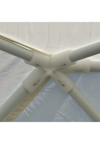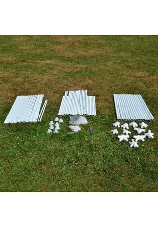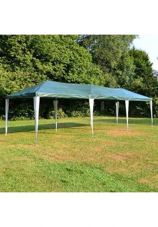 Einfach, leicht und praktisch. Dieser preiswerte 3×9-Meter-Pavillon mit seiner 110g/m²-PE-Plane überzeugt durch seine simple Bauart und sein geringes Gewicht. Besonders wenn man unterwegs schnell eine Überdachung braucht, leistet dieser Pavillon gute Dienste. Beim Aufstellen benötigen Sie keinerlei Werkzeug und die Montage kann durch das praktische Klicksystem bequem erledigt werden. Egal ob schnell die Kaffeetafel für den Geburtstag in den Schatten muss, der Angler am See vor Regen geschützt auf seinen Fang wartet oder die Clique beim Festival abends gemütlich feiert – ein ruckzuck aufgestelltes Dach braucht man immer mal. Die offene Bauart des Gartenzelts ermöglicht einen Zugang von allen Seiten. Bei Bedarf können Sie auch Ersatz-Seitenteile hierfür zum Verschließen bei uns erstehen (mit Fenster oder ohne Fenster). Die Plane besteht aus wasserabweisendem 110g / m² PE-Material und schützt Sie bei leichtem Regen und vor Spritzwasser – ideal als Unterstand, Windschutz, Sonnendach bei Eventveranstaltungen, als Flohmarktzelt, Schankzelt oder Jahrmarktzelt und Wetterschutz bei sonstigen Festivitäten. Bitte beachten Sie, dass es sich hierbei um eine Leichtbaukonstruktion handelt, die starkem Regen oder Sturm unter Umständen nicht Stand hält. Bauen Sie den Pavillon deshalb bei Unwetter ab, damit Sie lange Freude an diesem Partyzelt haben. Auf eine sichere Befestigung bzw. Verankerung des Zeltes ist zu achten! Farbe Dach grün einfarbig Schals grün-weiß gestreift Seitenteile grün-weiß gestreift 6 Seitenteile mit je 3 Fenster und 2 Seitenteile als Eingänge ohne Fenster mit Reißverschluss Länge 9 Meter Breite: 3 Meter Durchgangshöhe: 1,97 m Gewicht: 29 kg Material PE-Plane 110 g/m² wasserdicht Stahlrohrgestänge 32x25x19 mm Packmasse: 1 Karton L 1150 x B 320 x H 250 cm