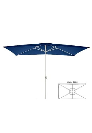 Wunderschöner Rechteckschirm mit einer Größe von 300×200 cm in klassischem Blau. Durch seine rechteckige Form eignet er sich besonders für den Einsatz auf Balkon oder Terrasse. Die Bespannung besteht aus 100% Polyester und ist mit einer Stoffstärke von 180g/m² nicht nur verrottungsfest sondern auch sehr widerstandsfähig. Der Schirm ist 235cm hoch, die Kurbel befindet sich in ca. 90cm Höhe. Mit Hilfe der integrierten Handkurbel lässt sich der Schirm ohne Kraftaufwand komfortabel öffnen und schließen. Die integrierte Windhaube hebt sich bei Wind und verringert so ein Aufblähen, Kippen und Beschädigen des Schirmes. Unser Sonnenschirm ist auch in den Farben: grün, champagner, weiß und terracotta erhältlich. Farbe Bespannung: blau Schirmgröße: 300x200cm Höhe: ca. 235 cm Kurbelhöhe: ca. in 90 cm Material: Polyester 180 g/m² verrottungsfest. Geteilter Stamm mit Kurbel, Stärke 38 mm aus weißem Metall Kopfgestänge mit 6 Metall-Streben aus Stahl, Farbe: weiß. Gewicht ca. 5 kg